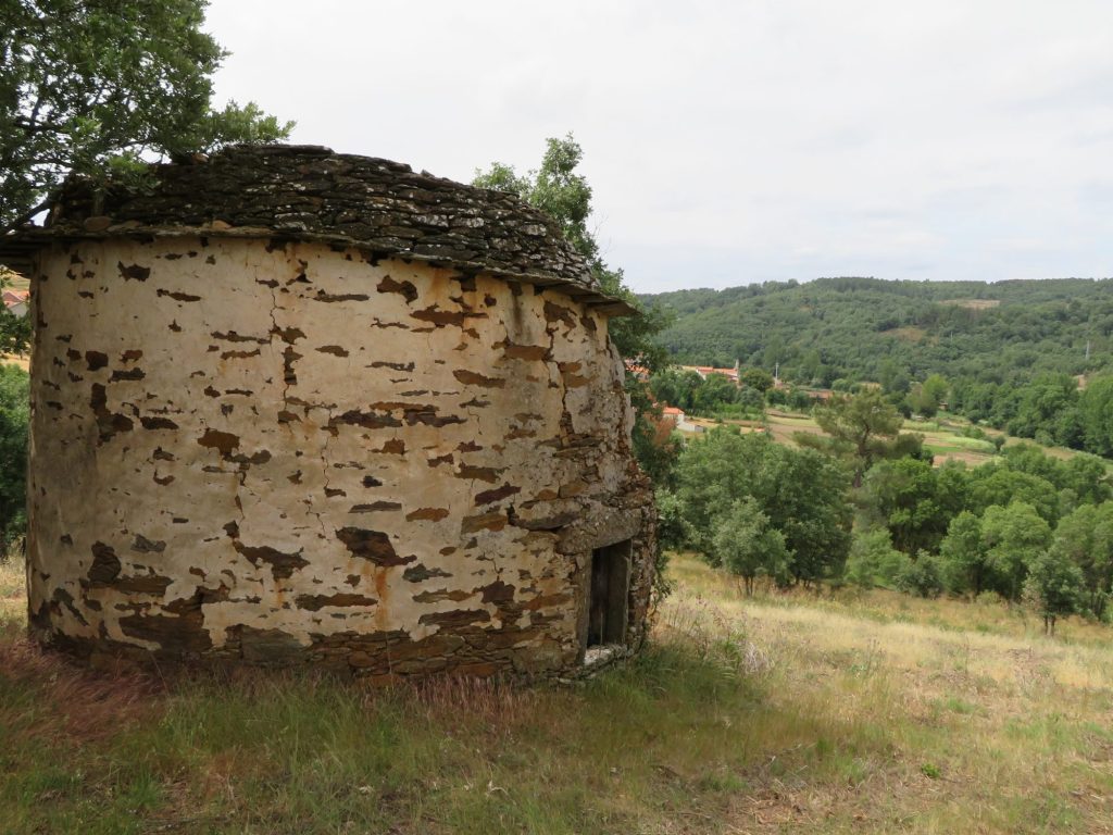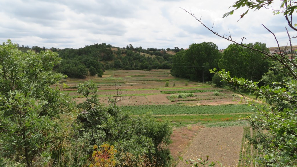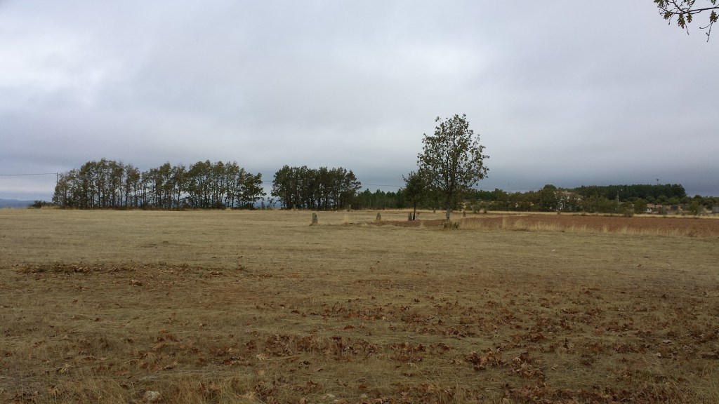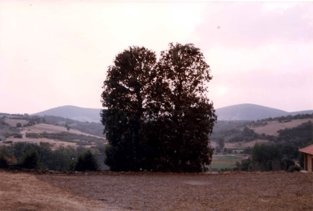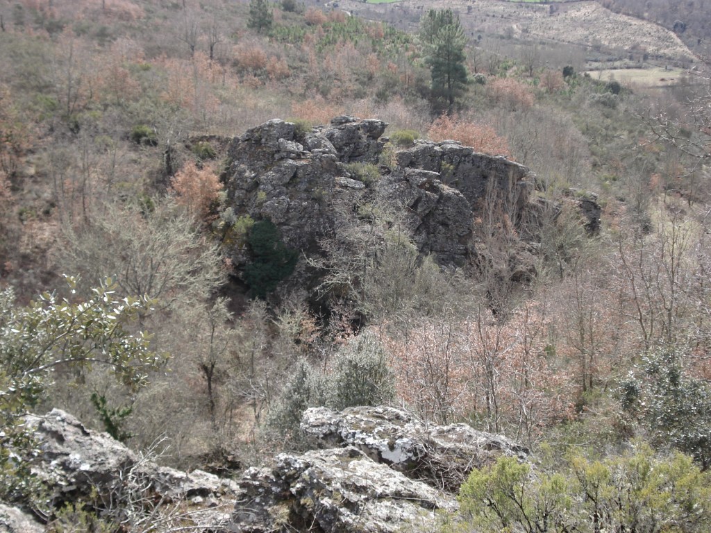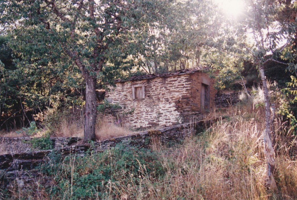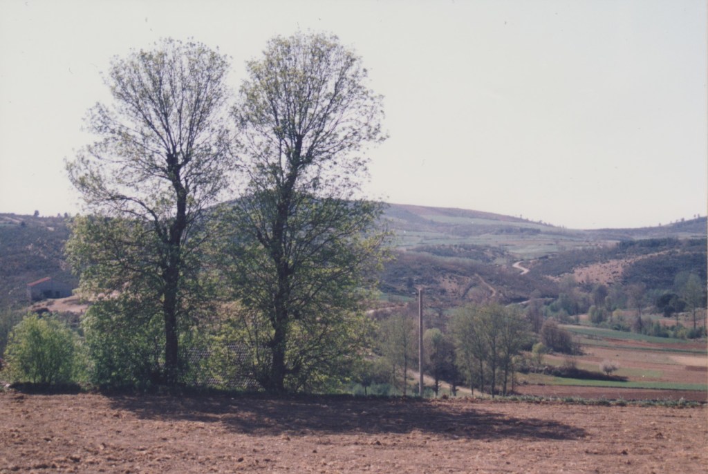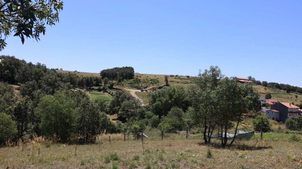 Mas, desta beç, andando ne l sou fai que fai, de la Puontelhina, bótan-se por Peinha Ferreira, Cuntorno i la Senhora pa Cabeço l Curbo; de l cimo de la Cuosta i de la Cruzica, por antre l Spino i l Ramalhal, pássan pa la Sapeira; dende, por Peinha Buieira na Stebica, l Chapeirón i Lhatas de l Meio, ban a dar al alto de Peinha la Bela. Pul camino – que ye cumo quien diç, de l’aire –, al passáren na Lhagona i na Stebica, adonde las tierras stan d’arada, béien un ou outro home, agarrado al arado i atrás dũa junta de bacas ou pareilha de béstias, al redor de las fragas, a bimar sues tierras. Mais adelantre, nũa touça de l Chapeiron, que pega cun Balhe de l Quadro, abístan tamien un ganado, culas canhonas todas çquiladas, amorrado ne l steio.