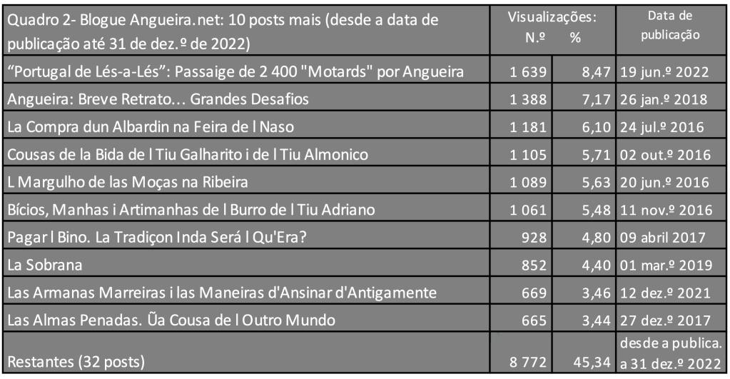 Hai, oumenos, dues rezones para s’ir a qualquiera lhado: an trabalho ou de besita. Quando se bai an trabalho, nun dá para ber quaije nada. Mas, se ye de besita, la cousa muda de figura pus nada mais hai que fazer. Anton, quando, pula purmeira beç, ls cucos passórun puls bários sítios para ber l termo d’Angueira, nin tiempo tubírun para oulhar an redor. Mas, agora, que tiempo lhibre nun les falta, ándan ne l sou fai que fai i stan eilhi pa s’adbertíren, que trabalho ye só ber l de ls outros.