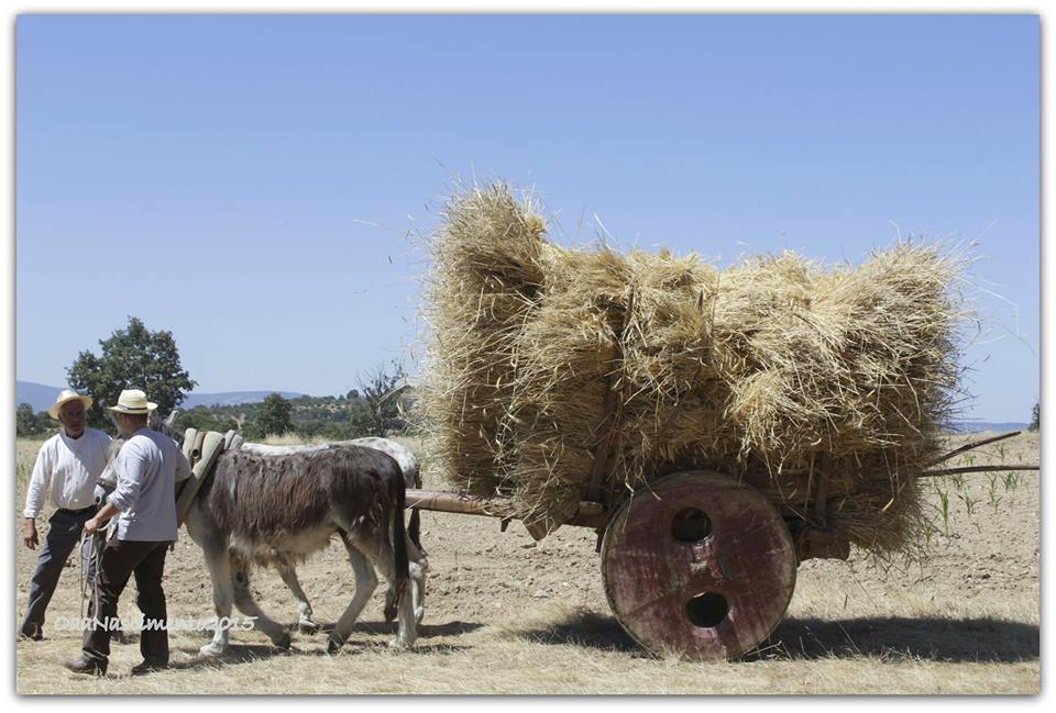 Ne l ampercípio de la tarde, yá an Belharino, nun de ls lhameiros de riba, que pega culs de Samartino, anda ũa família toda afadigada a cargar un carro de feno: un mocico i un garoto, cada qual cun sue spalhadeira, a ajuntar l feno de ls baranhos als muntones an dues fileiras de ganchadas, ũa dun lhado i outra de l’outro, de modo a que l carro passe pul meio, antre eilhas; l pai, cula spalhadeira carregadeira, a bendear ũa ganchada de cada beç pa riba de l carro; l filho mais bielho, an riba de l carro, a sigurar, amanhar i ancalcar las ganchadas i la carrada; atrás de l carro, anda la mai cul rastro, que parece un pende, a arrebanhar, ajuntar i a arrastrar l feno que bai quedando para trás, pa l home le botar pa riba de l carro. Bendeadas las ganchadas de cada lhado i a todo l cumprimento de l carro, l’home chama la junta de bacas pa l carro abançar pa las outras mais adelantre. Cargada la carrada, toca d’arratar i apertar, de la frente para trás i cruzar, apuis, de lhado a lhado, las lhúrias pa que l feno nun se perda i la carrada, culs solabancos, nun se sbarrulhe, pori, pul camino i nun chegue cumo debe ser al palheiro.