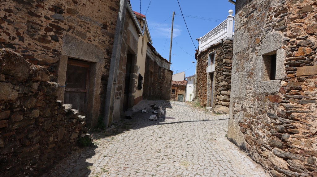Stafadicos de todo i cumo la fame nun era pouca, inda antes de çcansar un cachico, bótan-se a scarbar la tierra, a rebolar-se ne l puolo, a caçar i a quemer uns grilhos, sartigalhos i outros bechicos i a boer un golo d’auga na fuonte mesmo al lhado de l camino. De seguida, toca a drumir la séstia ne l fenanco de la touça de l lhameiro de riba.
