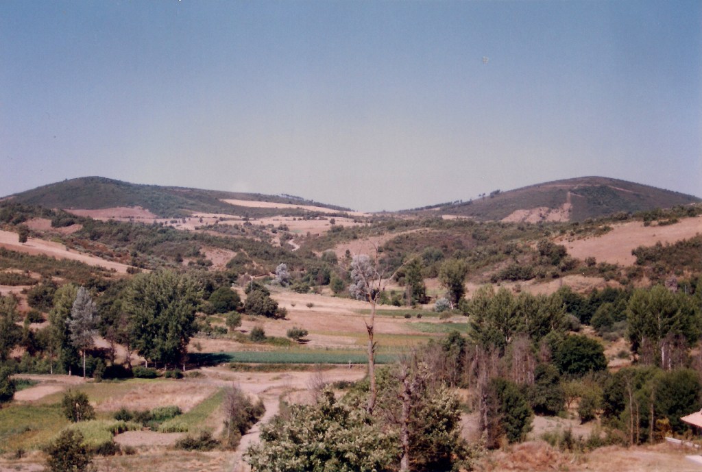 Vistas do campo da feira no santuário do Naso caras a poente: a povoação da Speciosa, os serros e os cabeços de Angueira, a serra de Avelanoso e os montes de Vale de Frades e Vale de Pena por onde passa a raia; da esquerda para a direita, as serras de Bornes, Nogueira i Montesinho e, lá atrás e mais longe, a serra da Sanábria, já em Espanha.