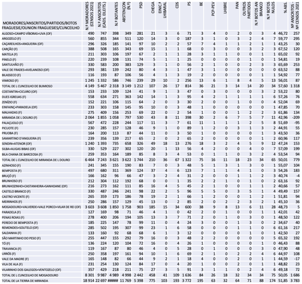 Pa quedardes a saber l stado a que, an termos de perda de populaçon, chegórun ls cunceilhos de la(s) Tierra(s) de Miranda, mas tamien todos ls outros cunceilhos de l Nordeste Stramuntano i de l Anterior de Pertual nun le quedórun muito atrás, bonda cunsultar ls dados de ls Censos 2021 ne l sítio de l INE na Anternet.